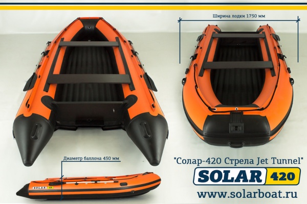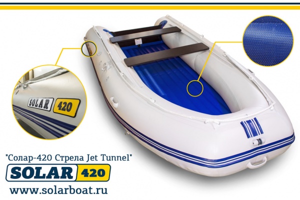 Солар-420 Стрела Jet tunnel это удлиннённая на 40 см версия хита наших продаж Солар-380 Jet tunnel. Модель содержит в своей конструкции, новейшую запатентованную (pat.145840) разрабоку нашей компании – водоводный тоннель ! Если Вы любитель покорять горные, порожистые, супермелководные реки – то такая лодка придется Вам по душе !