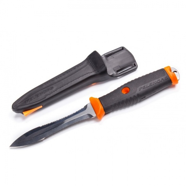 Нож для подводной охоты Pelengas Volga с магнитными ножнами. Нож с магнитным креплением Pelengas Volga доступен в следующих исполнениях: серрейтор-серрейтор, серрейтор-плейн. Материал лезвия коррозиестойкая нержавеющая сталь - импортный аналог 95х18, твердость 52нrc. Габариты: вес около 100 гр. общая длина ножа 25,6 см длина лезвия 11,2 см ширина лезвия в самом широком месте 2,2 см ширина лезвия в самом узком месте 1,7 см толщина лезвия 2,5 см. высота ручки 3 см В обойме ножен предусмотрено четыре гнезда под магниты. Установлены в посадочные места только два, остальные идут в комплекте. При помощи изменения числа магнитов в ножнах, каждый сможет самостоятельно отрегулировать усилия прилагаемые для извлечения ножа из ножен. Отличный нож для подводной охоты.